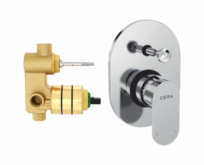 High flow single lever concealed diverter system consisting of Exposed part (lever, tip ton knob, flange, cartridge sleeve) and Concealed part (45 mm cartridge with button assembly)